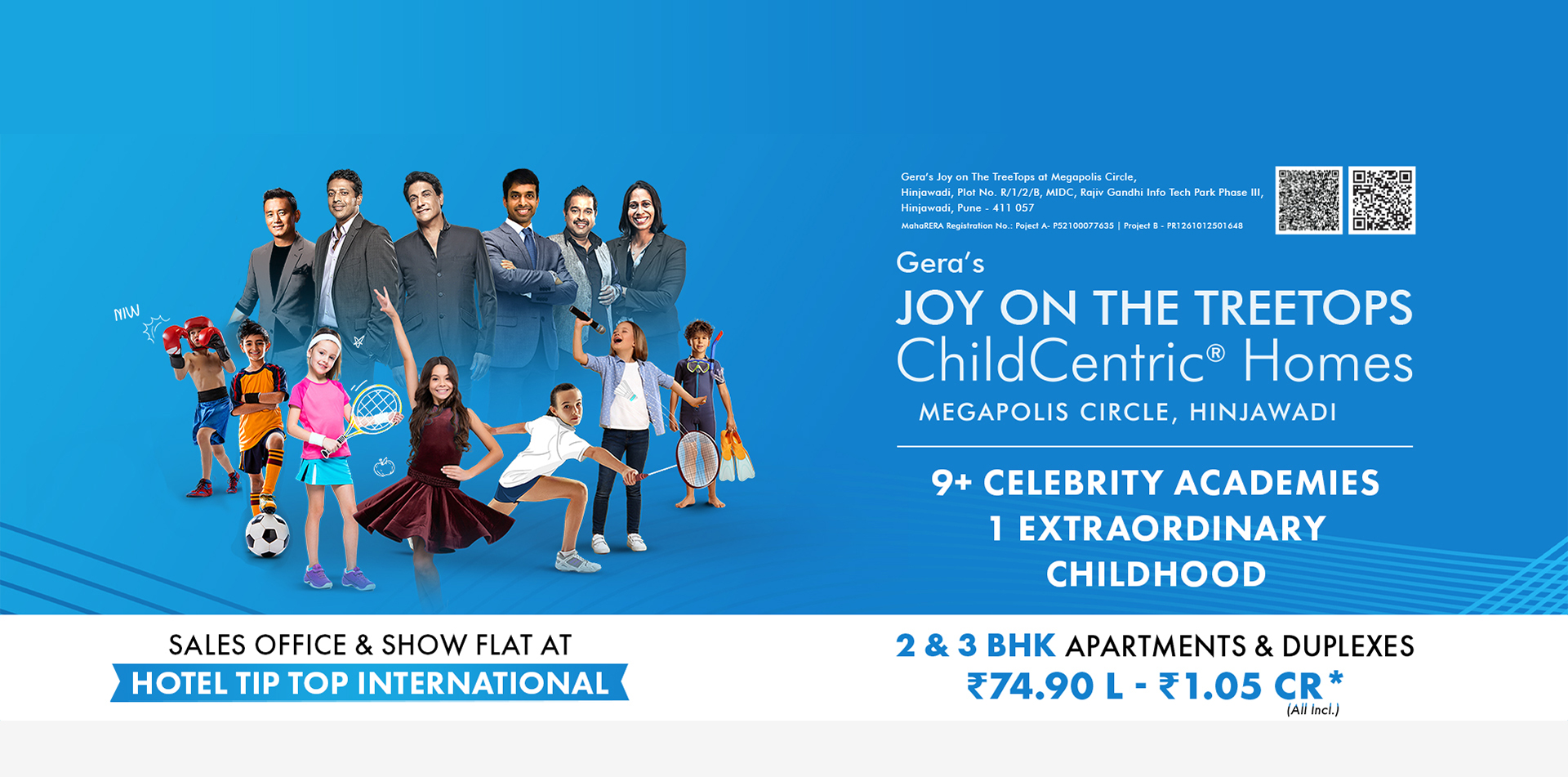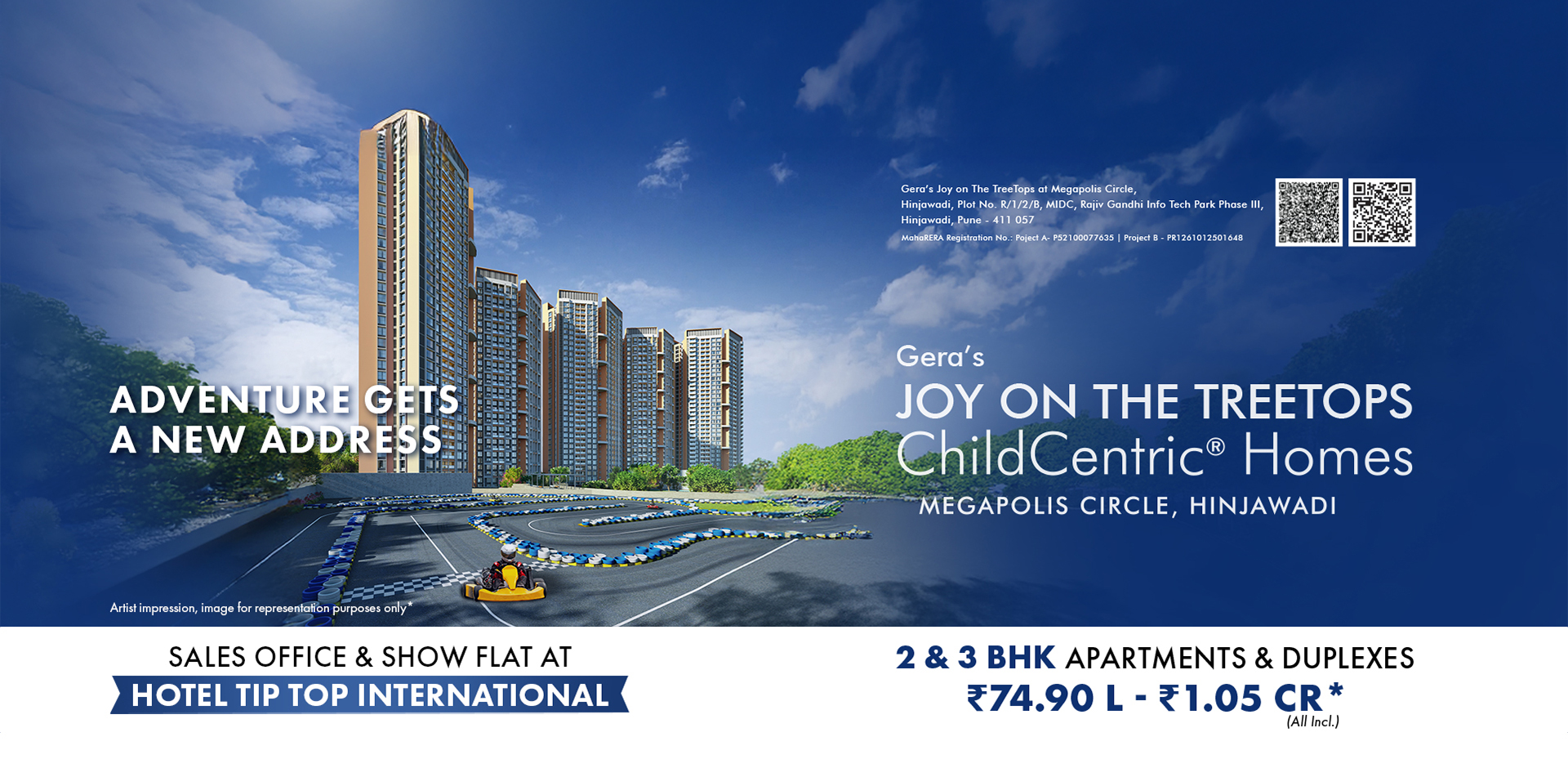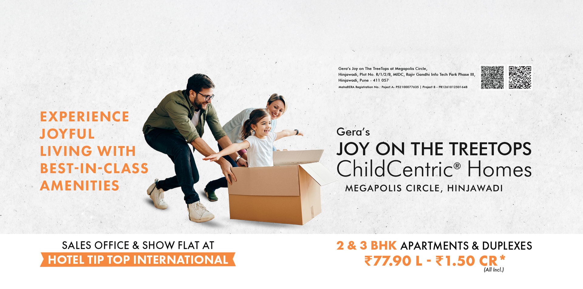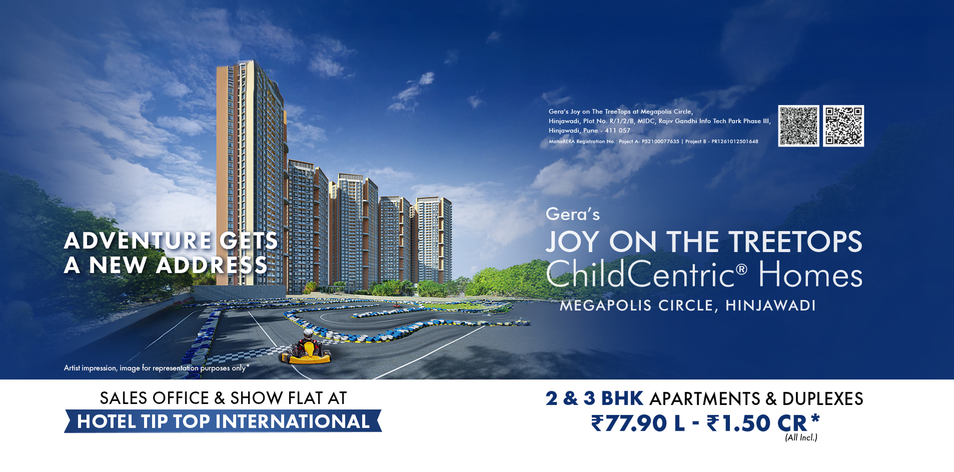 Introducing Gera’s Joy on The Treetops, Hinjawadi’s first-ever ChildCentric® Homes (CCH), where family living meets 10.7 acres of unparalleled luxury. With a 35,000+ sq. ft. clubhouse and over 30 thoughtfully curated open-to-sky amenities, such as an exclusive electric Go-Kart racing track, a half-Olympic-sized temperature-controlled swimming pool, and bowling alleys, Joy on the Treetops redefines the concept of modern living. Our portfolio spans across 700+ thoughtfully designed 2 and 3 BHK homes. Strategically located near Megapolis Circle and the upcoming metro station in Hinjawadi Phase 3, Gera’s Joy on the Treetops offers unobstructed views of scenic hills, guaranteeing superior air quality and a serene living experience.
