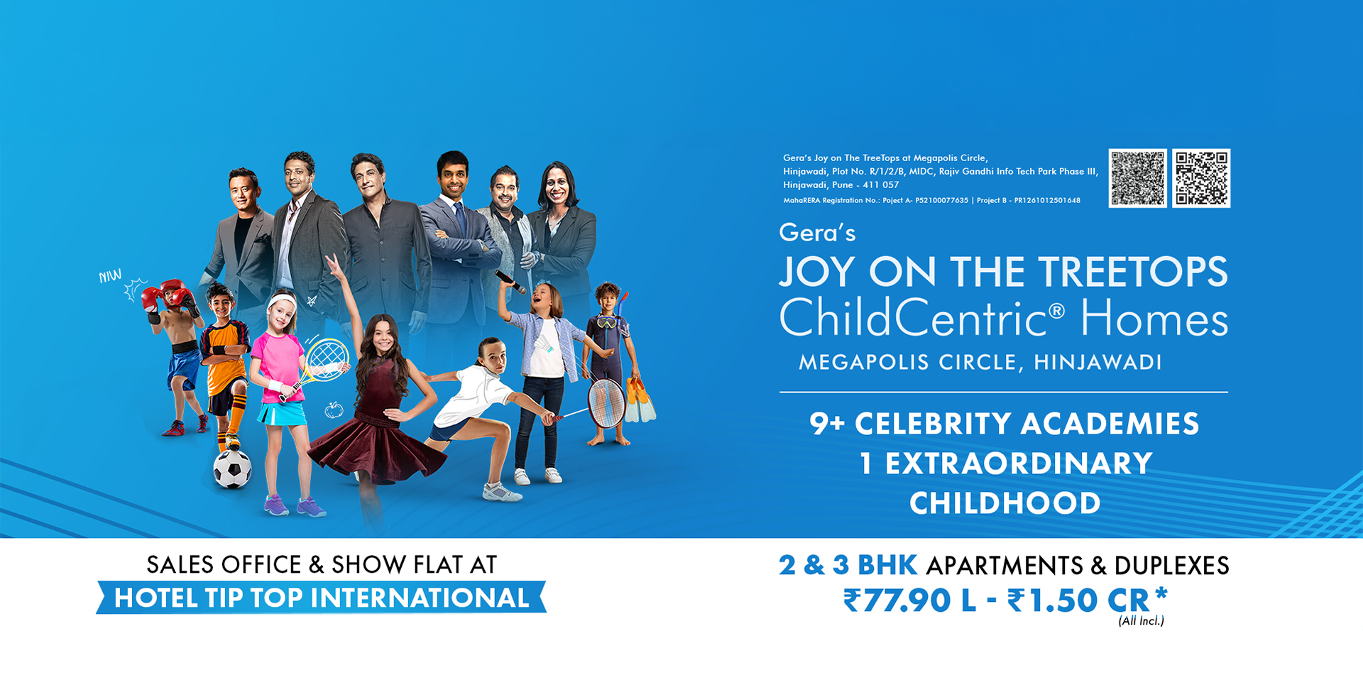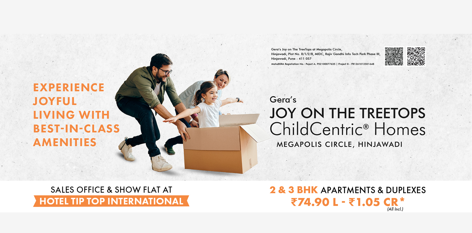 Introducing Gera’s Joy on The Treetops, Hinjawadi’s first-ever ChildCentric® Homes (CCH), where family living meets 10.7 acres of unparalleled luxury. With a 35,000+ sq. ft. clubhouse and over 30 thoughtfully curated open-to-sky amenities, such as an exclusive electric Go-Kart racing track, a half-Olympic-sized temperature-controlled swimming pool, and bowling alleys, Joy on the Treetops redefines the concept of modern living. Our portfolio spans across 700+ thoughtfully designed 2 and 3 BHK homes. Strategically located near Megapolis Circle and the upcoming metro station in Hinjawadi Phase 3, Gera’s Joy on the Treetops offers unobstructed views of scenic hills, guaranteeing superior air quality and a serene living experience.
