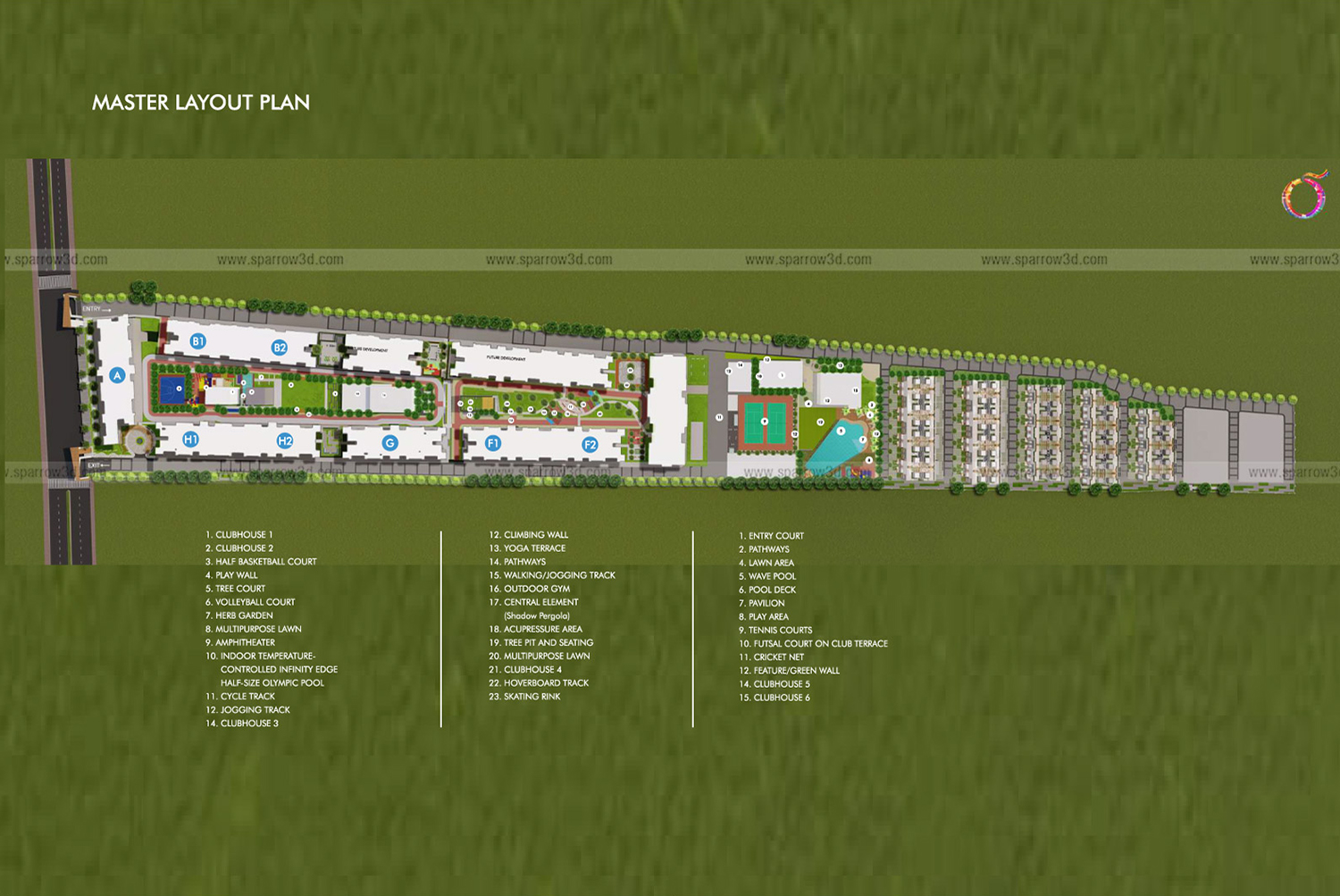 Wave Pool | Pool Deck | Tennis Court | Gymnastics Room | Spa | Doctor's Room | Mini Theatre | Lounge | Open Air Theatre | Jogging Track | Rock Climbing Wall | Basketball Court