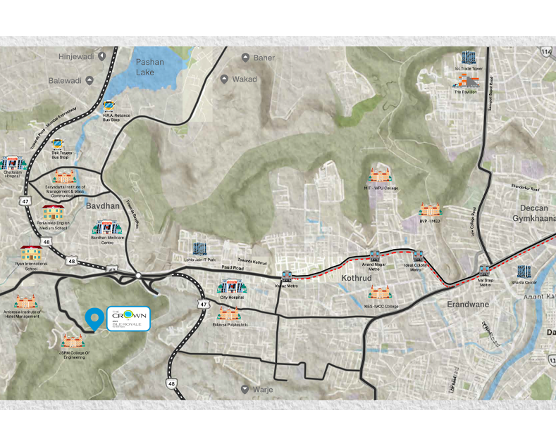 The Crown at Gera’s Isle Royale gives residents unmatched access to Pune’s best IT hubs, business districts, shopping centers, schools, and hospitals. Daily life flows with ease today, and tomorrow will be even smoother with improved road networks and the Metro line. Weekend escapes are effortless, with direct routes to Mulshi, Khadakwasla, Lonavala, and Mumbai. And being so close to such a powerful junction means steady property value today, with even greater appreciation tomorrow.